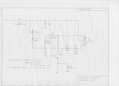 It turned out that the timing light was drawing too much current because the inverter wasn't oscillating; it was just loading the power supply. So, I set about reverse engineering the timing light. Following are the two schematics I came up with; one for the primary (inverter) circuit, and one for the secondary (DC power supply) circuit.